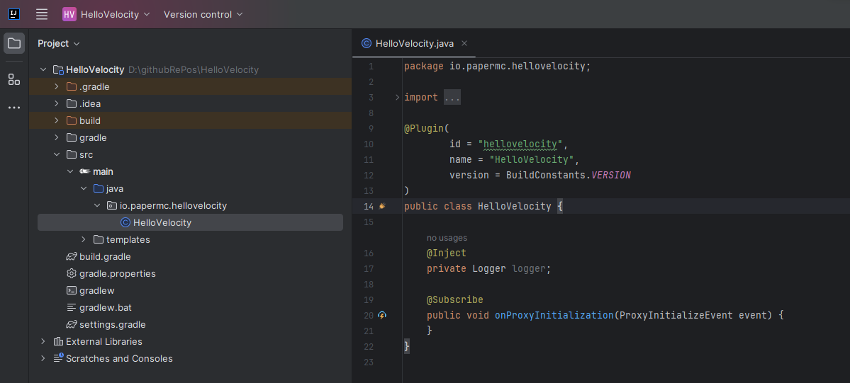 You should now have a project set up with Velocity as a dependency. All you have left to do now is to compile your plugin and run it on a Velocity server.